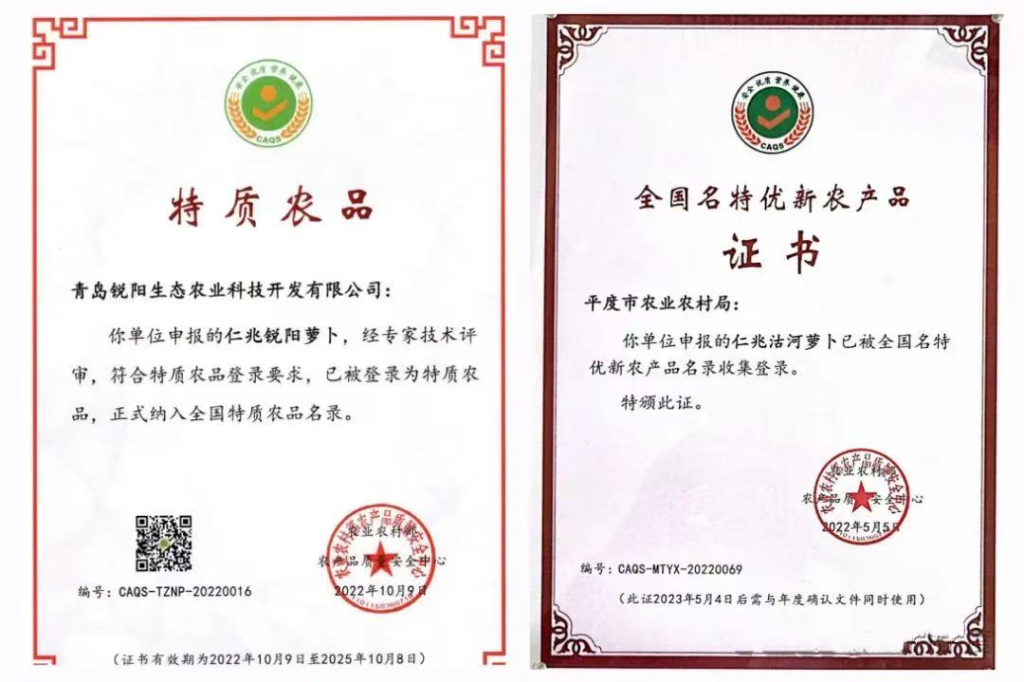 2022年,“仁兆沽河萝卜”与“仁兆蒜薹”先后入选“全国名特优新农产品”名单,成为山东省和青岛市唯一一家同时拥有两个国家级名特优新农产品的企业。在潍县萝卜品质提升大赛中,“萝卜的尖叫”力压有着300多年栽培历史的传统品种,斩获金质奖。如今,该品牌通过农业部绿色食品认证,成为中央电视台持续追踪报道的“网红产品”,价格虽比普通萝卜高10倍却供不应求,年销售额破千万。