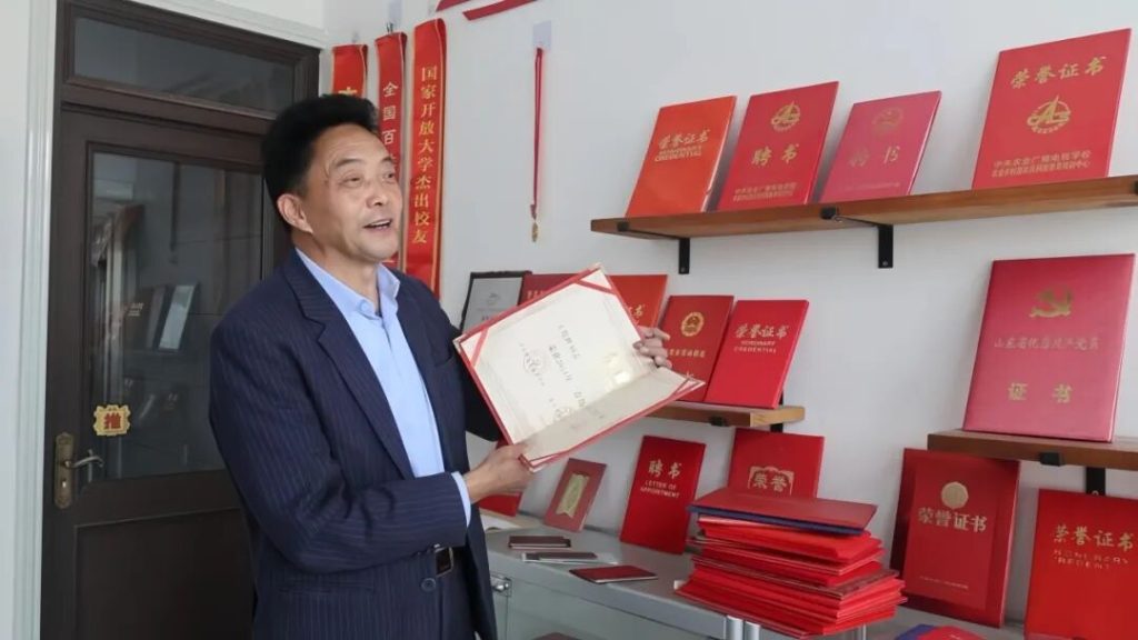 山东省优秀共产党员、青岛市最美科技工作者、第七届山东省科普奖突出贡献个人……八十余项荣誉沿墙铺展,每项荣誉都对应着一段攻坚历程。1991年山东省农业广播学校的中专文凭静静陈列,与中央农广校教师聘书形成鲜明对比,勾勒出从农技学徒到行业导师的完整成长链。2019年作为首位农民当选青岛市最美科技工作者的经历让他刻骨铭心,当小学生捧着鲜花敬礼时,他真切体会到“为农服务”四字的千钧重量。